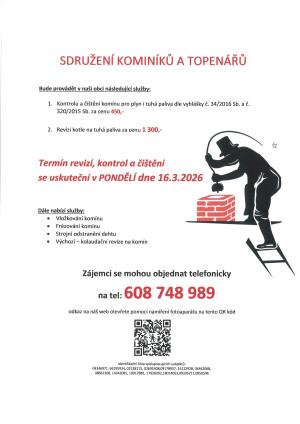 Sdružení kominíků a topenářů bude provádět v naší obci v ÚTERÝ dne 20.1. 2026 požadované kontroly a čištění komínů pro plyn i tuhá paliva za následující ceny: - Čištění komínů: 450 Kč - Revize kotlů na tuhá paliva: 1.300 Kč Dále nabízí levné vložkování a frézování komínů, revize tel. 608 748 989