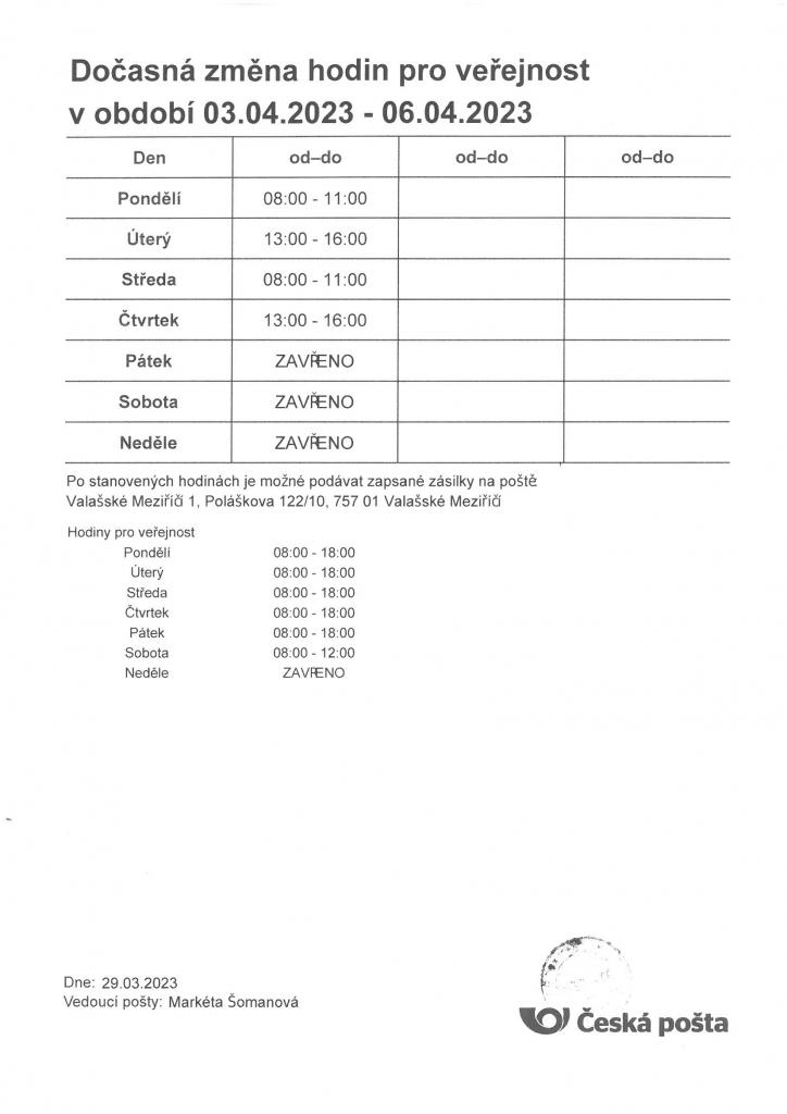 Dočasná změna hodin pro veřejnost provozovny pošta Choryně - 3.4.2023 - 6.4.2023 Pondělí a středa: 8:00 - 11:00 hod. Úterý, čtvrtek: 13:00 - 16:00 hod. Pátek: zavřeno