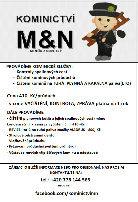 Budou prováděny kontroly a čištění komínů, spalinových cest, čištění spalinových cest u plynových kotlů a revize kotlů na tuhá paliva.. Cena za čištění a kontrolu i se zprávou o provedení kontrol a čištění činí 410,-Kč.