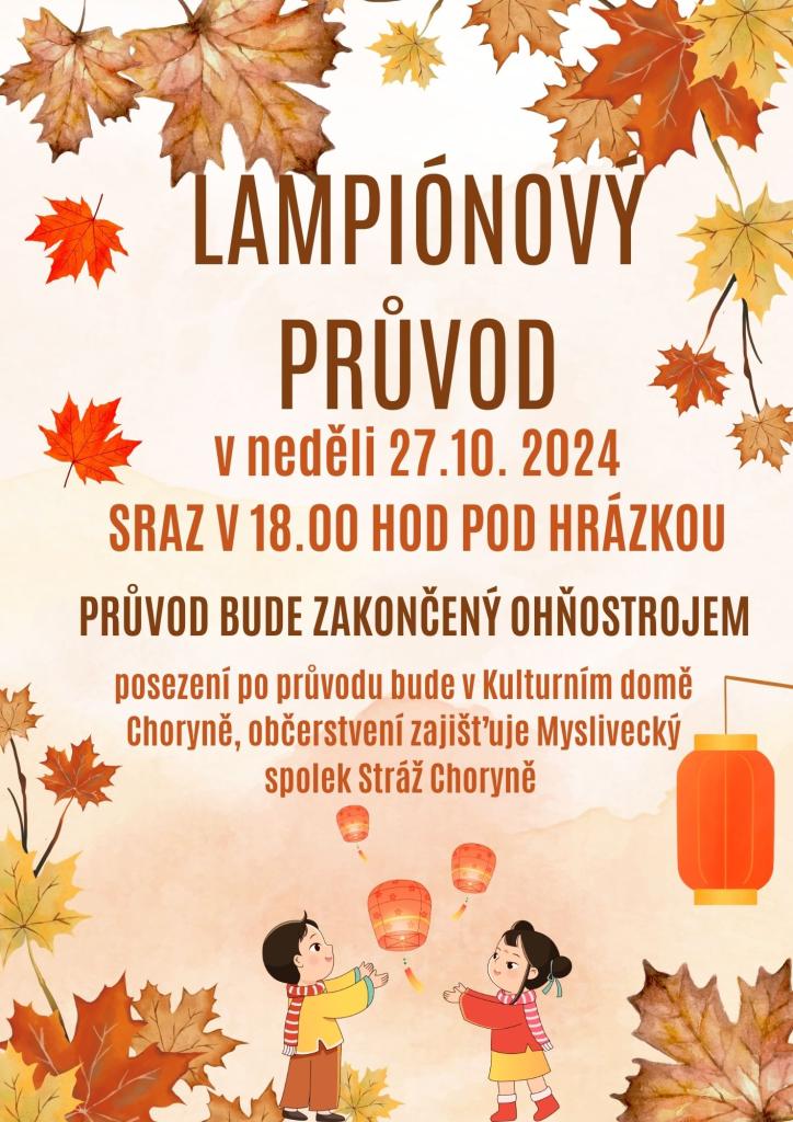 Průvod bude zakončený ohňostrojem. Posezení po průvodu bude v KD Choryně. Občerstvení zajišťuje Myslivecký spolek Stráž Choryně, připraven bude dančí guláš a párek v rohlíku.