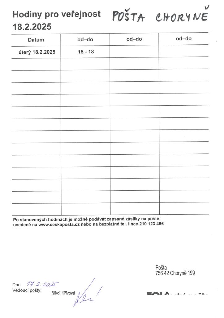 Pošta Choryně - Út 18.2.2025 změna hodin pro veřejnost