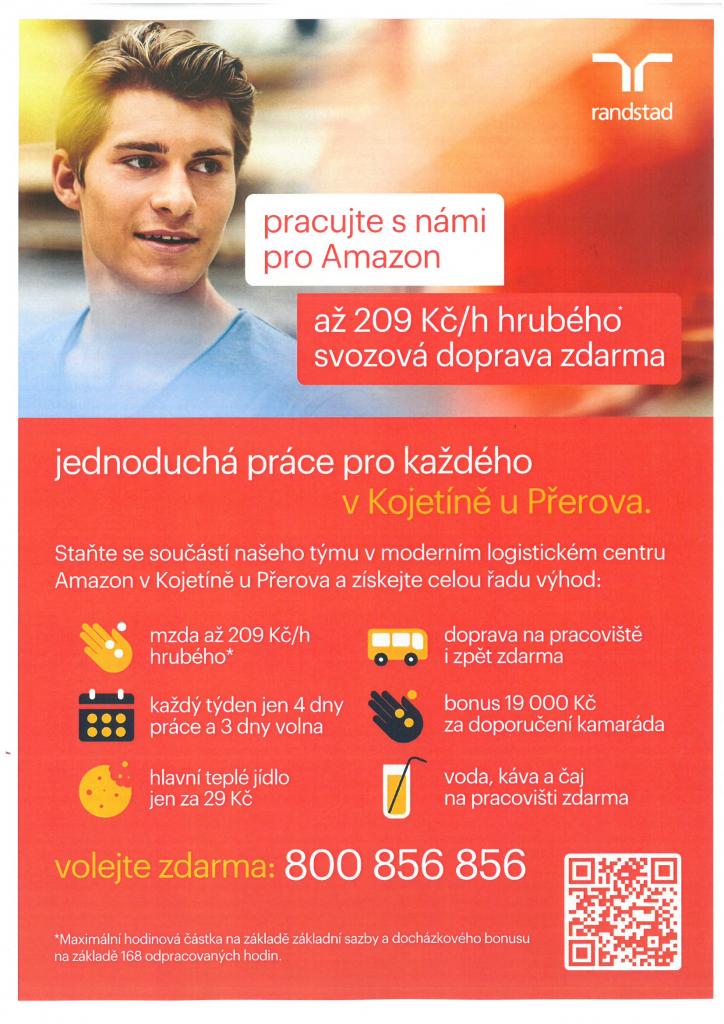 Hledáte práci? Distribuční centrum Amazonu v Kojetíně u Přerova, hledá nové zaměstnance. Mzda až 209 Kč/hod, svozová doprava na vybraných trasách zdarma, práce 4 dny v týdnu a 3 dny volna, dotované stravování a další výhody. Pro více informací kontaktujte pers. agenturu Randstad na tel. 800 856 856