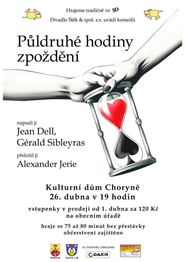 Divadlo Štěk a spol. z.s. uvádí komedii Půldruhé hodiny zpoždění, která se uskuteční v KD Choryně. Hraje se 75 - 80 minut bez přestávky. Občerstvení zajištěno. Vstupenky v prodeji za 120,- Kč na OÚ Choryně.