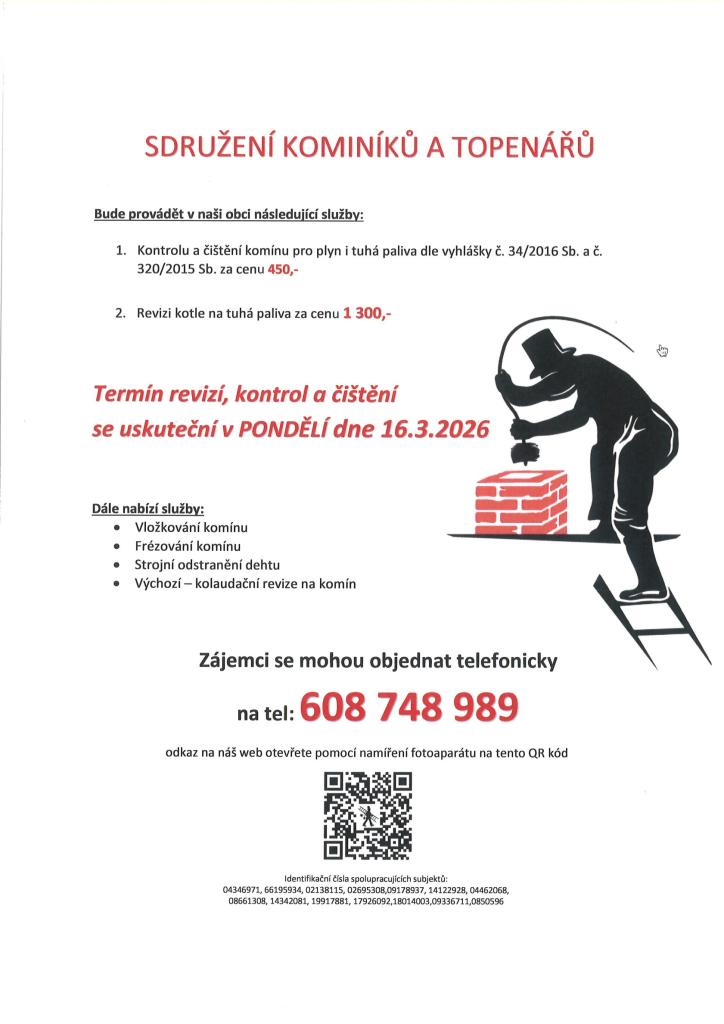 Požadované kontroly a čištění komínů pro plyn i tuhá paliva. Čištění komínů: 450 Kč Revize kotlů na tuhá paliva: 1.300 Kč Dále nabízí levné vložkování a frézování komínů, výchozí-kolaudační revize. Zájemci se mohou objednat na telefonním čísle: 608 748 989.
