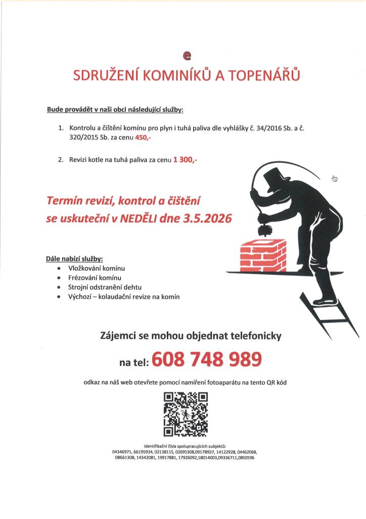 Sdružení kominíků a topenářů bude provádět v naší obci v NEDĚLI dne 3.5. požadované kontroly a čištění komínů pro plyn i tuhá paliva dle zákona č. 34/2016 Sb. za následující ceny: