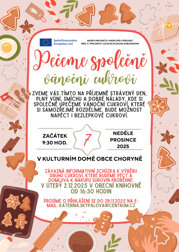 Společně si upečeme cukroví, které si samozřejmě rozdělíme. Bude možnost napéct i bezlepkové cukroví. Informativní schůzka 2.12.2025 v obecní knihovně od 16:30 hod. Přihlášky do 28.11.2025 na e-mail: katerina.skypalova@centrum.cz