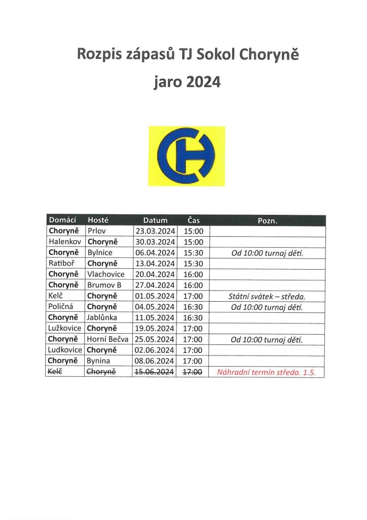 Rozpis zápasů TJ Sokol Choryně jaro 2024