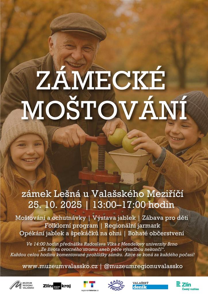 V neděli 25. října ožije zámek Lešná u Valašského Meziříčí vůní čerstvých jablek, pohodovou zábavou a atmosférou tradičního podzimního moštování. Od 13 do 17 hod. zde proběhne akce pro celou rodinu s názvem Zámecké moštování. Na programu jsou ukázky lisování jablek, ochutnávky moštů a dalších ovocných produktů, folklórní vystoupení, tvůrčí dílny a spousta dalších zábavných aktivit. Chybět nebude ani občerstvení. Více na https://www.muzeumvalassko.cz/akce-a-vystavy/zamecke-mostovani-1