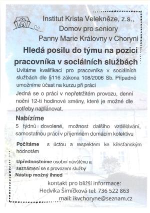 Domov pro seniory Panny Marie Královny v Choryni hledá posilu do týmu na pozici pracovníka v sociálních službách. Nástup možný ihned. Bližší informace - Hedvika Šimíčková tel. 736 522 863.