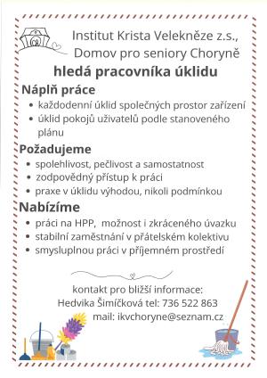 Domov pro seniory Panny Marie Královny v Choryni hledá pracovníka úklidu. Bližší informace - Hedvika Šimíčková tel. 736 522 863.