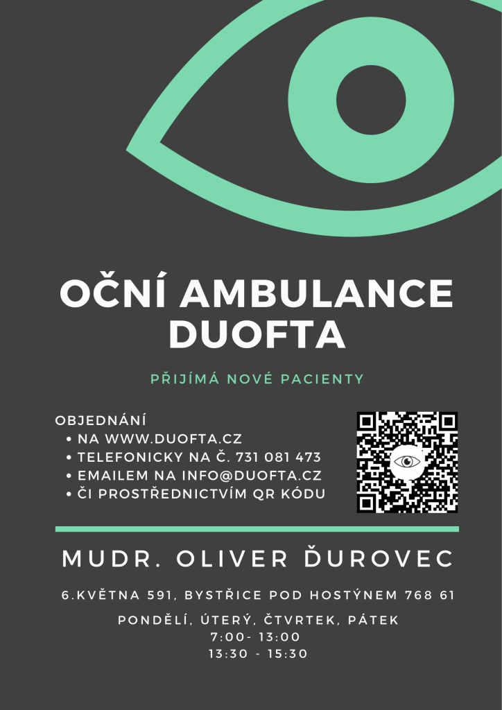 Oční ambulance DUOFTA, s.r.o. v Bystřici pod Hostýnem na ulici 6. května 591 nabírá nové pacienty, krátká objednací doba, odborný přístup a moderní přístrojové vybavení. Ordinuje MUDr. Oliver Ďurovec. Ordinační doba pondělí, úterý, čtvrtek a pátek od 07:00 do 15:30hod. Objednání na tel.č. 731 081 47