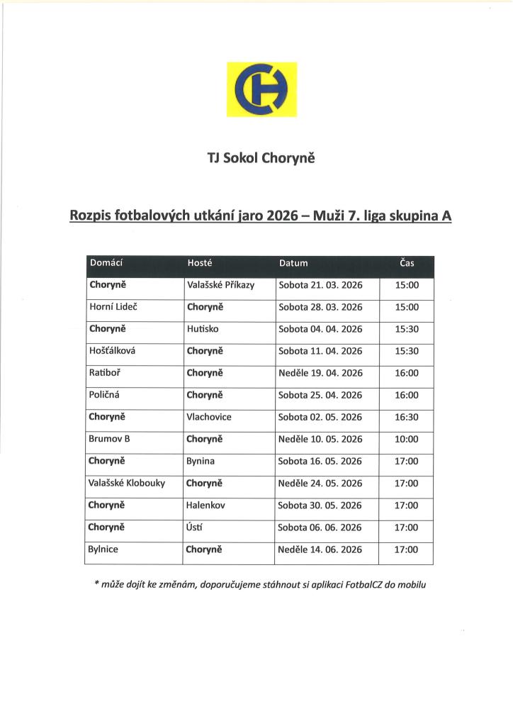 Rozpis fotbalových utkání jaro 2026 – Muži 7. liga skupina A. Může dojít ke změnám, doporučujeme stáhnout si aplikaci FotbalCZ do mobilu.