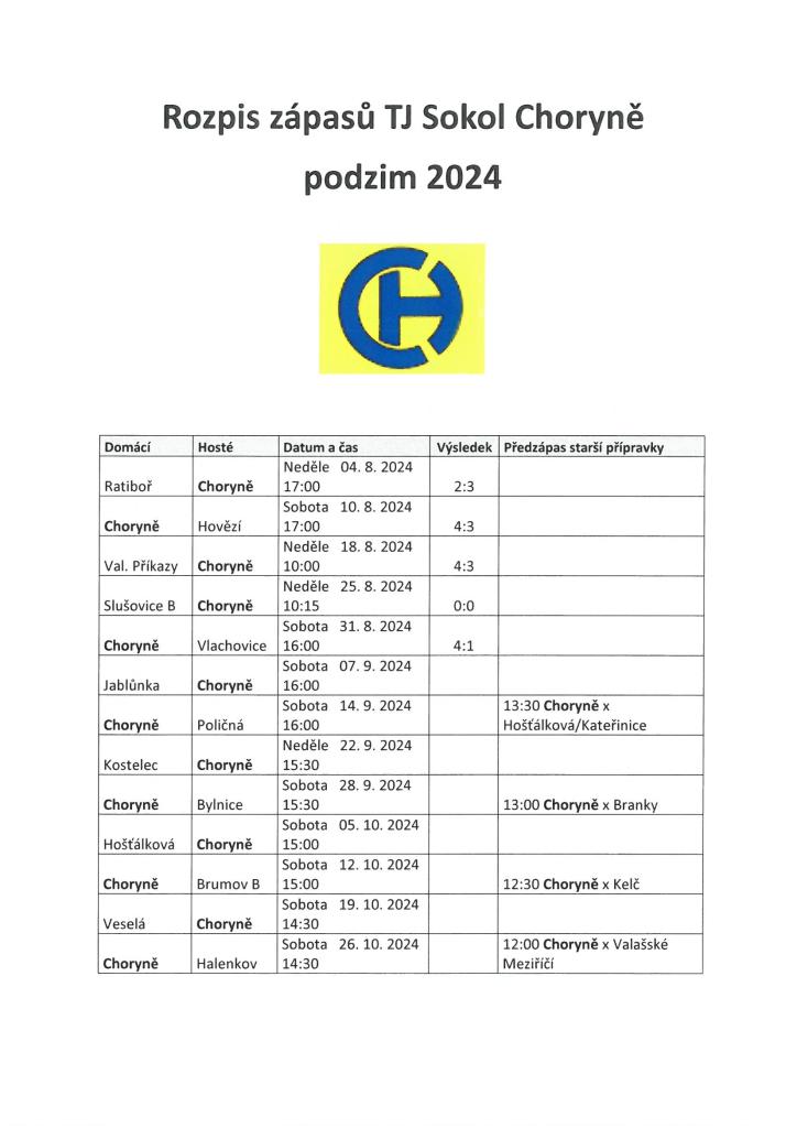 Rozpis zápasů TJ Sokol Choryně - podzim 2024 1