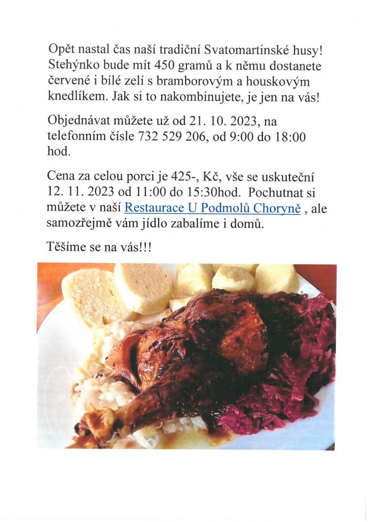 Cena za celou porci je 425-, Kč, vše se uskuteční 12. 11. 2023 od 11:00 do 15:30hod. Pochutnat si můžete v naší Restaurace U Podmolů Choryně , ale samozřejmě vám jídlo zabalíme i domů.