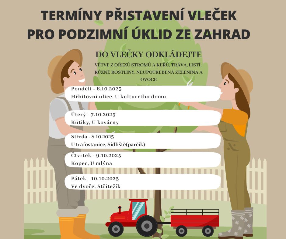 Termíny přistavení vleček pro podzimní úklid ze zahrad 6.10. - 10.10.2025