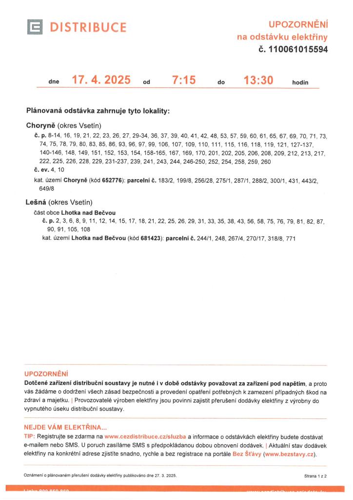 Upozornění na odstávku elektřiny 17.4.2025 2